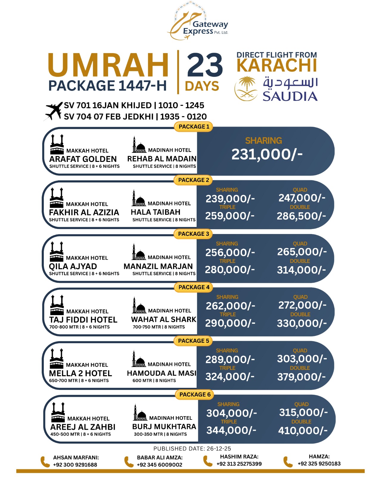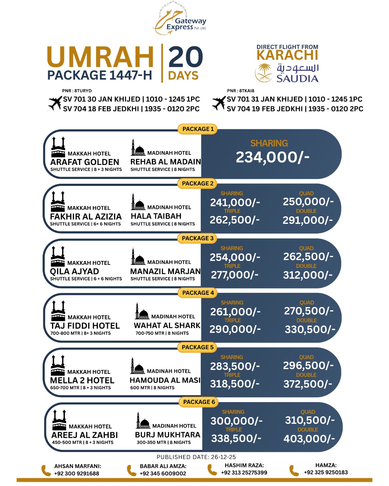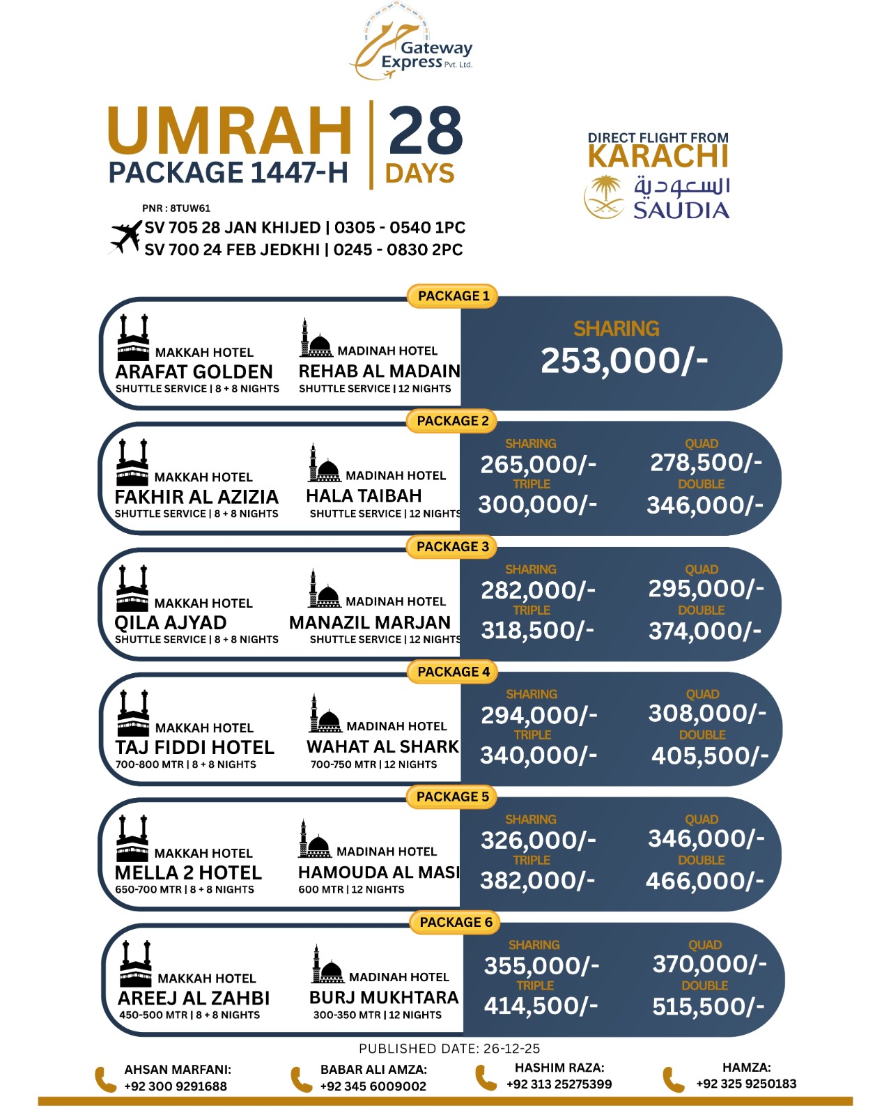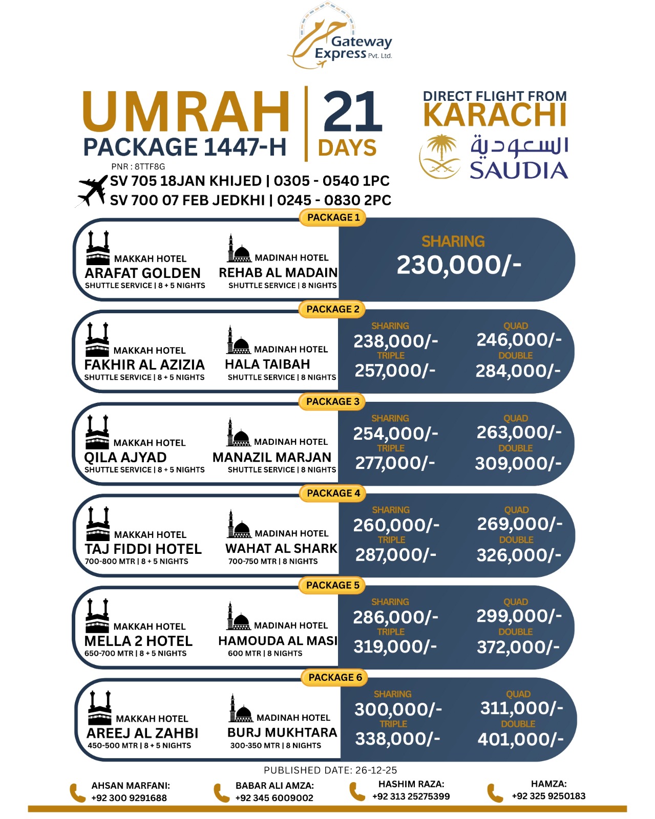 “Very professional service. They explained the complete Umrah process clearly before departure. Hotels were near Haram and the group leader was cooperative throughout the journey.”
